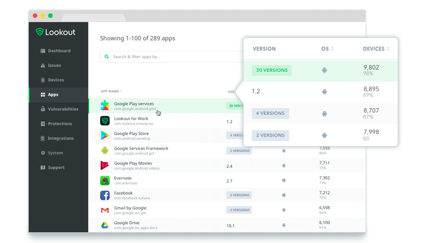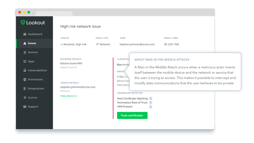 Lookout is de nummer 1 op het gebied van mobile security. Met een eenvoudig registratieproces, gebruiksvriendelijke beveiligingsinstellingen en begeleiding van uw medewerkers bij het verhelpen van problemen op hun tablets, smartphones en Chromebooks, wordt de mobiele kant van uw organisatie beveiligd.