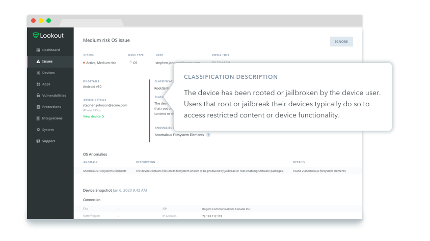 Lookout creëert een vingerafdruk van elk mobiel apparaat en vergelijkt deze met de 185 miljoen apparaten in ons beveiligingsplatform om anomalieën en risico's te identificeren, zoals: